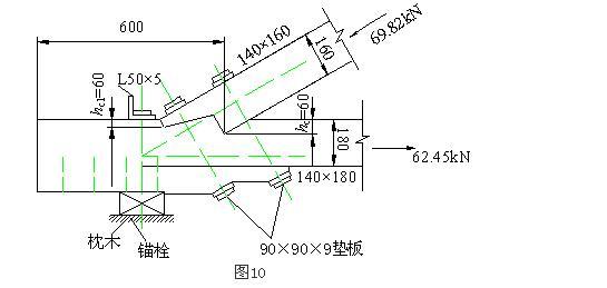 如图10所示,三角形木屋架的支座节点,按恒载产生的上弦杆轴向压力设计值为69.82kN(恒载加活载其值为87.84kN),下弦杆轴向拉力设计值为62.45kN,上下弦杆夹角26°34',木材采用红松。 根据以上材料,回答35-37题: 按齿连接承压验算时,下列哪一项是正确的?( )