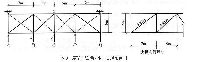 某房屋三角形屋架的山墙处抗风柱上端支承于屋架的上、下弦横向水平支撑架。下弦横向水平支撑布置如图8,钢材为Q235钢。节点风荷载设计值已求出:P1=10.73kN,P2=22.13kN,P3=21.23kN。 根据以上材料,回答26-28题 支撑桁架中斜杆bc的拉力,与下列何项数值最接近?( )