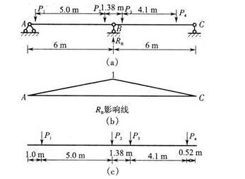 试确定图(a)所示吊车梁在吊车轮压下支座B的最大反力为( )(已知:P1=P2=250kN,P3=P4=182kN)。