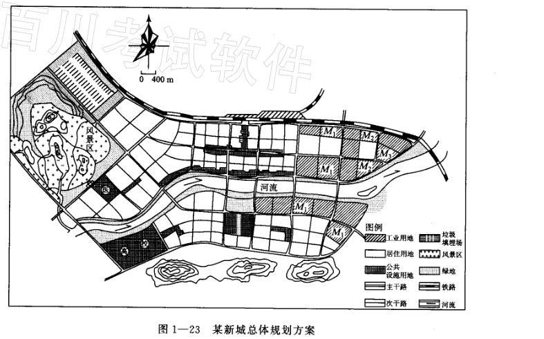 某市是以省域城镇体系规划为依据拟规划发展人口规模为25万左右的一座新城市,图1一23所示为新城总体规划方案,经专家评审基本同意方案的框架,但对部分工业用地、部分居住用地以及垃圾填埋场用地等方面提出了应予改进的意见。