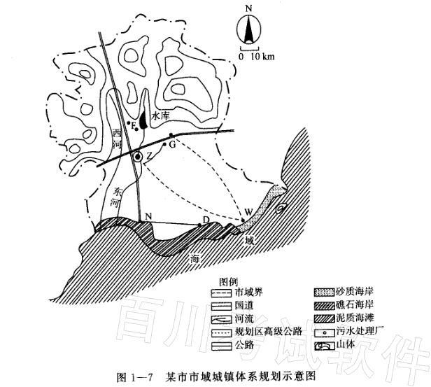 图1一7为某地级市的市域城镇体系规划示意图。该市北部为山区,中部为山前平原,南部为滨海平原。有两条国道呈十字叉形在市域内通过。