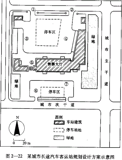 某中等城市长途汽车客运站规划设计方案(如图2-22所示),规划用地临城市主次}道,两条干道均设置有城市公共汽车站点。该方案将长途站的长途客车间、发车区和站前广场分别布置在车站主体建筑售票大厅的两侧。