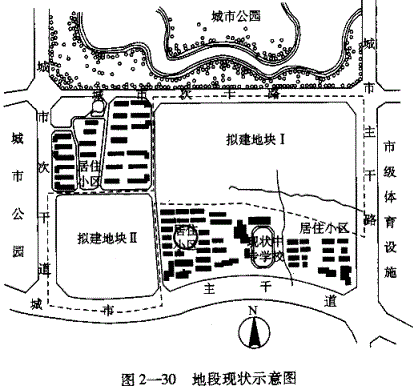依据该两地块土地出让的规划设计条件,分析还有哪些规划设计条件需要补充(地段现状如示意图2-30所示)。