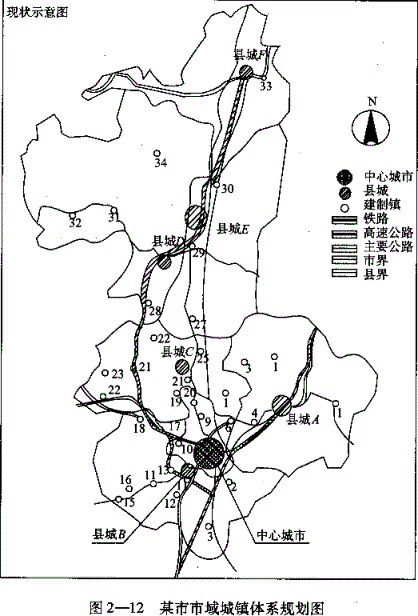 我国西南地区某地级市,其南部为丘陵,北部为山区,山区经济以农林为主。受地形条件影响,城镇主要集中在南部和中部地带,市域城镇化水平在35%左右,市域内现有大城市1个,县城6个,其他建制镇34个,规划为求市域内城镇均衡发展,在北部地区新设3个镇,市域交通规模基本符合发展要求。其规划示意图如图2-12所示。