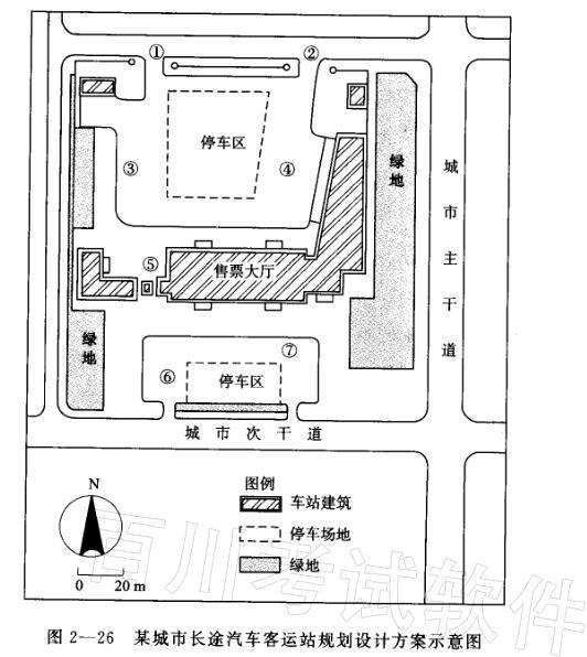 某中等城市长途汽车客运站规划设计方案(如图2—26所示),规划用地临城市主次干道,两条干道均设置有城市公共汽车站点。该方案将长途站的长途客车间、发车区和站前广场分别布置在车站主体建筑售票大厅的两侧。
