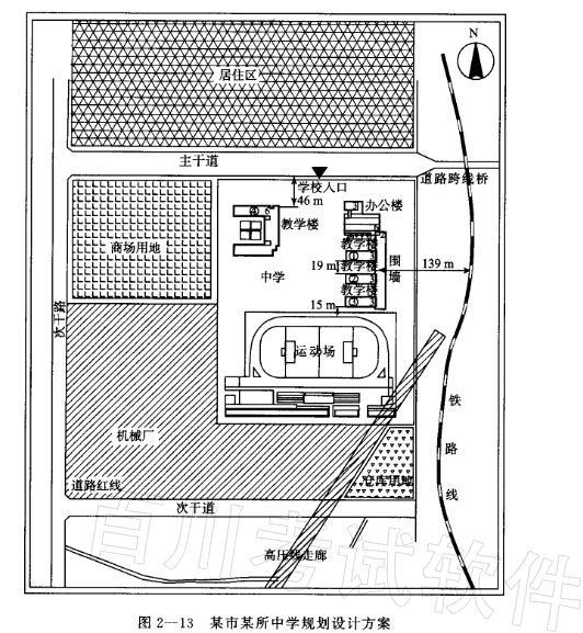 1.选址环境不当。学校选址不应紧邻工业厂区,容易受到噪声、污染等的干扰。 2.校园内不允许有架空高压线通过。 3.主要教学楼层数过高,造成使用不便和安全隐患。教学楼一般不宜超过4层。 4.学校的出入口不宜开在城市主干道上,无法避免时,学校门前应留出足够的缓行地带,避免交通事故。 5.④号教学楼距离城市主干道太近,容易受到噪音干扰。主要教学楼外墙与道路通侧路边距离不应小于80m。 6.①、②、③号教学楼之间的距离过小,③号教学楼距离运动场太近。根据学校设计规范要求,教室长边相对或与运动场之间的间距应不小于25m,以避免噪声干扰。 7.教学楼与铁路间距不够。主要教学楼用房的外墙与铁路的距离不应小于300 m。 8.运动场长轴方向不宜东西向布置,易造成眩光,影响使用。