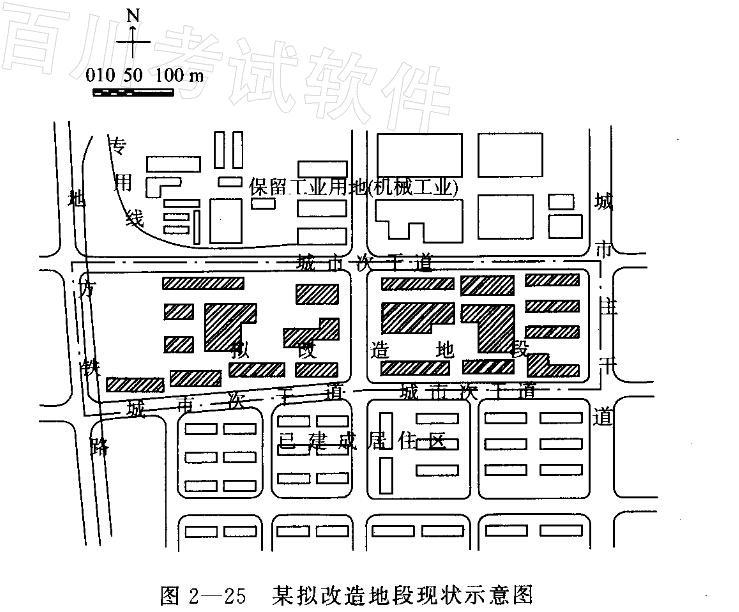 某市中心区的一个拟改造地段,占地41.1公顷,现状基本为工业,其中有少量质量完好有历史保留价值的工业厂房,应保护和合理利用;该地段拟按总体规划确定居住用地要求进行了改造,地段北侧为保留的工业用地,现多为机械工业,有噪声干扰;西侧为地方铁路;南侧为已建设成十年的居住区,配套公建明显不足。(地段现状如图2—25所示)
