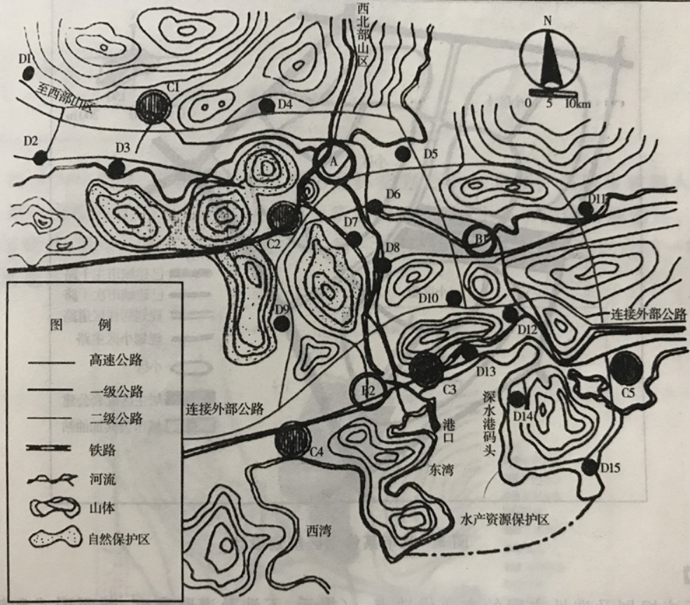 (1)深水港不宜设置在东湾,设置在东湾港影响水产资源自然保护区,自然保护区应以旅游开发为主,建议在西湾建港。 (2)石化工业布局分散,应适当集中。其中C2、C3不宜设置为石化工业区,C2临近自然保护区,并且四面环山易造成污染;C3影响自然保护区和旅游开发;此外,C5应向北靠近公路远离海岸;。 (3)高速公路选线不合理,C4与A之间联系不直接;此外高速公路布置偏多,D5以东一段没有必要,且垂直等高线穿越山体不合理。