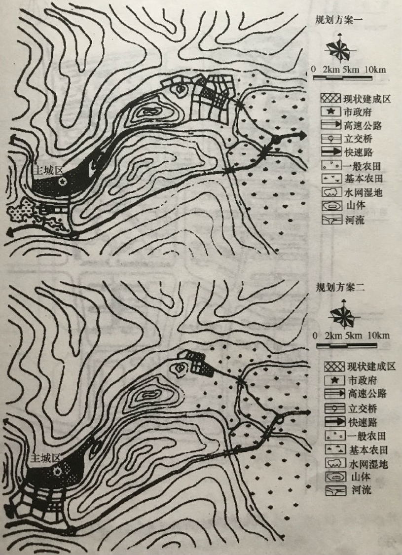 为了引导城镇建设的有序发展,该市着手对城市总体规划进行修编,并对城市的发展方向提出两个比较方案(见附图)。
