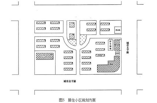 图5为某城市一以多层住宅为主的居住小区规划方案,面积19hm2,东侧和南侧为城市主干路。根据城市规划条件,方案中规划1个小学、1个幼儿园和1个加油站。