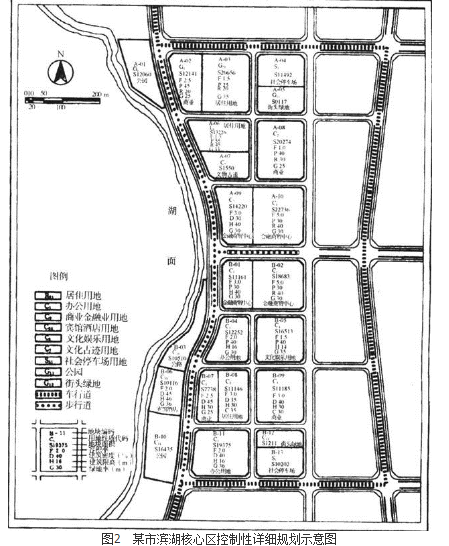 某市为历史文化名城,滨湖核心区面积约50hm2,决定编制滨湖核心区的用地控制性详细规划方案。湖面及外围地段是重要的风景旅游区,因此,要求核心区开发项目的安排充分考虑旅游风景区的特点,沿湖设立保护绿带以保证湖面的景观,开发强度不宜过高。交通组织上要将旅游线路和主要车流分开。规划方案如图2所示。