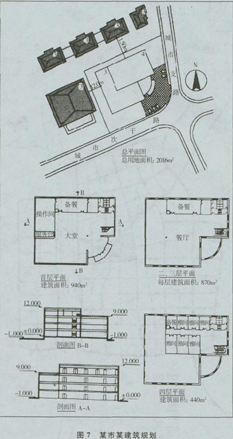某拟建项目位于某市风貌建筑保护街区内的城市次干路与城市支路的交口处,总用地面积为2016m2,用地位置为办公建筑。除按有关规范规定的要求外,还提出以下规划条件,即:建筑限高12m,容积率不大于1.4,建筑密度不大于35%,建筑间距应满足南北向大于新建建筑高度的1.5倍、东西向大于新建建筑高度的1.2倍的要求,建筑风格要求与周边现有建筑相协调,屋顶须采用坡屋顶形式。该建筑规划图如图7所示: