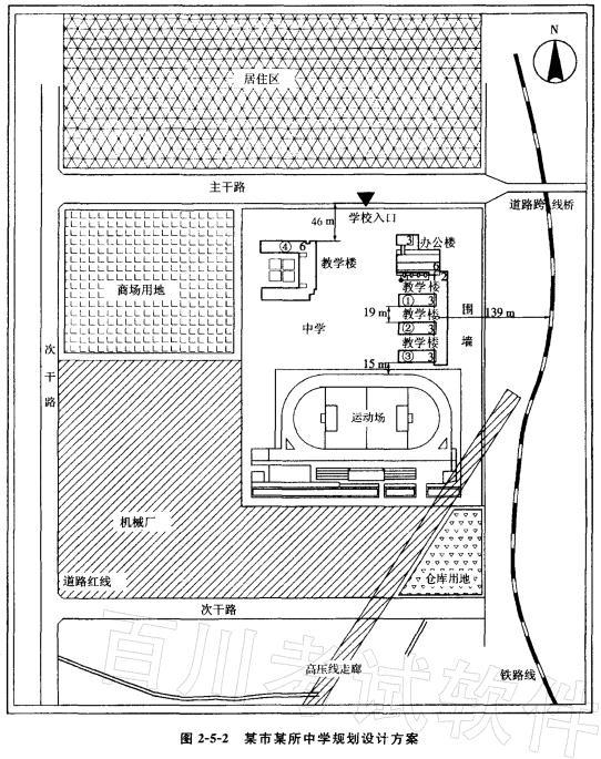 图2-5-2所示为某城市一所中学的设计方案。请指出学校选址及总平面设计中存在的主要问题。