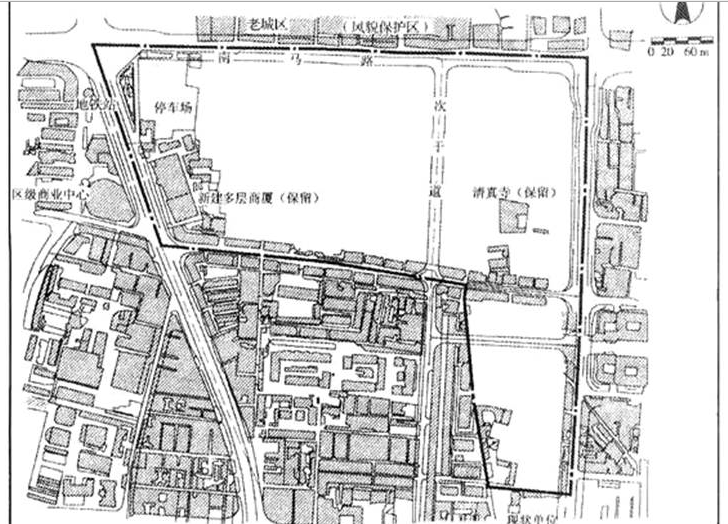 某开发建设单位申请在某大城市(国家级历史文化名城)市中心区的一个地段内进行旧城区改造,开发住宅、商业、办公等项目,其性质与城市总体规划相符。该地块面积约21.8公顷,东、西两侧面临城市主干道,南侧现状(低层)商业街,西侧为已初具规模的区级商业中心,地块周边地区人文环境要素众多,交通繁忙,西侧主干道(二号大街)上有规划地铁线通过(地块现状见图5)。