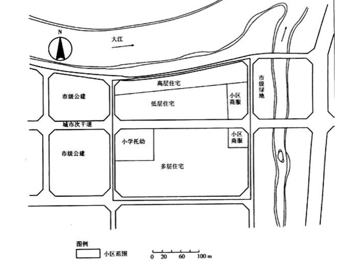 某开发商拟建在滨江规划建设一居住小区,用地规模约12公顷,提出了一个用地功能的布局初步设想(见图3)。