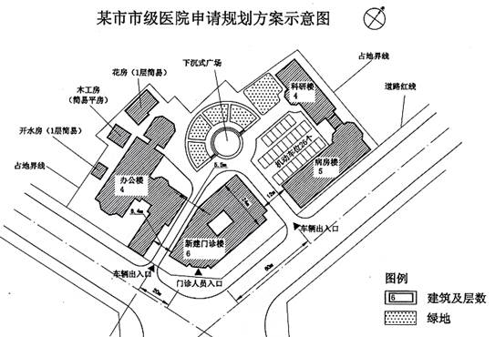 某市中心区有一座市级医院,地处两条交通繁忙的城市干道交叉口的西北角,占地面积为0.48公顷。医院为改善门诊设施,决定将位于临街转角处二层门诊楼原地改建为6层,并提出了医院改建总平面方案图(见图5)。改建之后的全院总建筑面积为14000平方米。
