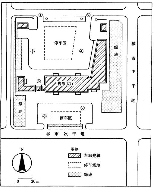 车辆进站出站流线应当顺应城市道路中的车辆行驶方式,一般以右转进出为宜。长 途汽车为大型客车,所需停车空间较大,位于车站建筑后侧,城市小汽车所需停车空间较 小,位于站前广场。长途车到达区应靠近旅客出站口,并与城市接客车辆上客区有良好联 系。长途车发车区应靠近候车大厅。从长途车到发流线、城市接送客车辆流、旅客出发流 线、旅客到达流线四个流线来看,具体选择安排如下: (1)长途客车进站口:①; (2)长途客车到达区:③; (3)到达旅客出站口:⑤; (4)长途客车发车区:④; (5)长途客车出站口:②; (6)城市送客车辆下客处:⑦; (7)城市送客车辆上客处:⑥。