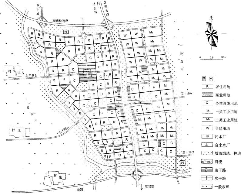 图2为某大城市外围一个新城的总体规划示意图。该区现状为一般农田,河流以西和高速公路以东也为一般农田及少量村庄,已建有高速公路一条,呈南北走向(北至主城,南至邻市),北有城市快速路,南有郊区公路,西南部有河流通过(规划蓝线100米)。