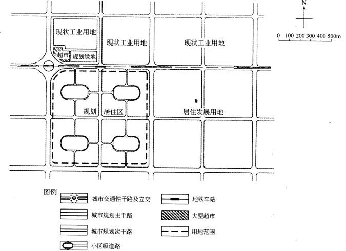 某大城市外围规划一处大型居住用地,并拟建城市主、次干路及地铁线路服务于该地区(车站位置如图3所示)。规划居住区内的路网系统相对独立,在交通性干道的北侧配套建设一个大型超市。