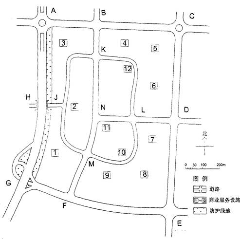 图4为某平原城市拟开发建设的一个居住区规划设计方案。居住区总用地约87公顷,可容纳3.5万人居住;居住区路网(含居住区外围道路)在经过与公共绿地、防护绿地、建筑及各类设施统一规划布局的相互调整后已经确定。