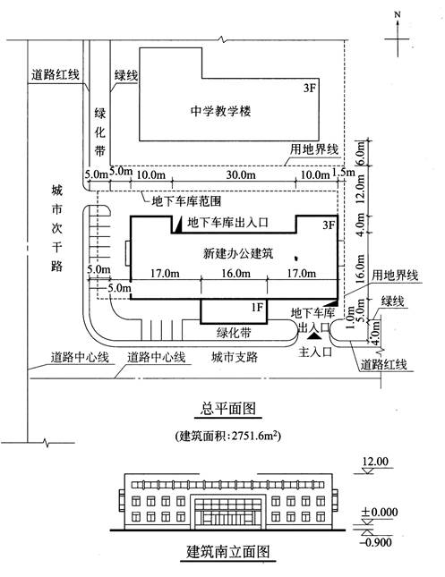 西侧为城市次干路,红线宽度30m,设5m宽绿化带,用地界线至绿线;南侧为城市支路,红线宽度l5m,设5m宽绿化带,用地界线至绿线;北侧为3层砖混结构的中学教学楼,用地界线至围墙;东侧用地界线至围墙。