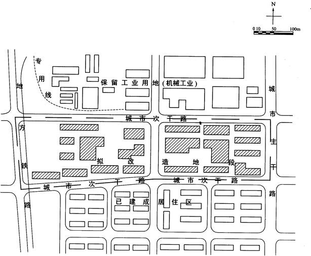 某市中心区的一个拟改造地段,占地41.1hm2,现状基本为工业,其中有少量质量完好有历史保留价值的工业厂房,应保护和合理利用。该地段拟按总体规划确定的居住用地要求进行改造。地段北侧为保留的工业用地,现多为机械工业,有噪声干扰;西侧为地方铁路;南侧已建成十年的居住区,配套公建明显不足(地段现状见附图)。