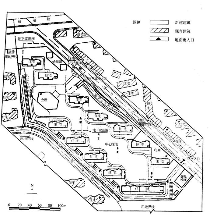 附图及附表为北方一城市某房地产商通过土地出让方式所获得的住宅商品房建设用地,该用地北邻城市快速路,东、南与西侧均为现状居住用地。其中《土地出让合同》所规定的土地使用条件如下: