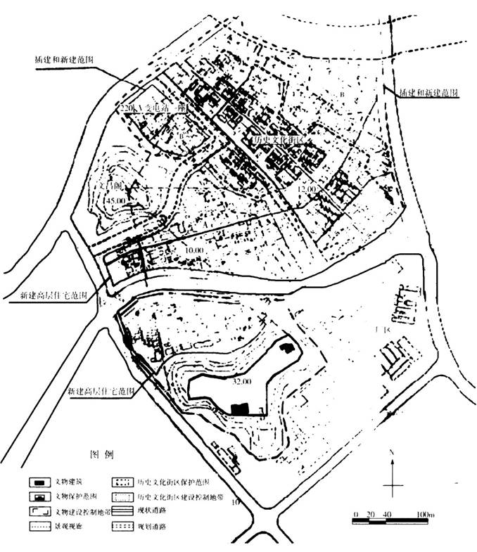 该地区现状居住人口密度大,传统居住建筑失修,周边市政基础设施缺乏,居住环境较差当地政府启动了该地区的保护与更新项目,项目实施范围如图所示。首先,除保留文物保护单位、历史建筑和近代厂房外,拆除了规划地段内的其他建筑。同时正式委托某专家编制该地区的详细规划。该规划在历史文化街区的建设控制地带内(B地区)插建和新建以四、五层为主的条式住宅;为求得资金平衡,在历史文化街区控制地带以外(A地区)建设35米的高层住宅;南部的近代工业建筑调整为创意产业园;在地段周围开辟城市主干路和若干支路;增设220kV变电站。详见规划示意图。