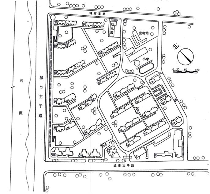 (1)布局结构:组团规模不均,差距较大;部分建筑日照间距不够,小学操场在南侧33F 住宅的阴影下。 (2)公共建筑:小学紧邻变电站,有影响;小学运动场不应东西朝向;幼儿园位置较偏,服务半径不足;变电站服务半径不足。 (3)交通:道路系统层级联系混乱,道路不畅、尽端路过长;地下车库出入口均离小区主路出入口较远,不便于使用;小区开口太多,不便于管理;高层消防通道不妥,登高场地不够。 (4)环境景观:无中心绿地;建筑群体空间未充分利用;靠河边主干道未加防护绿带,还通长布置了地面停车场。 (5)指标:容积率有可能超标。高度没有限制,33F 住宅的经济性不太好。