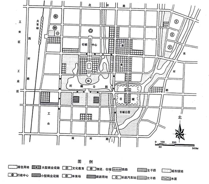 4.在行政中心以东,古城北侧规划两片大开型商业设施用地。