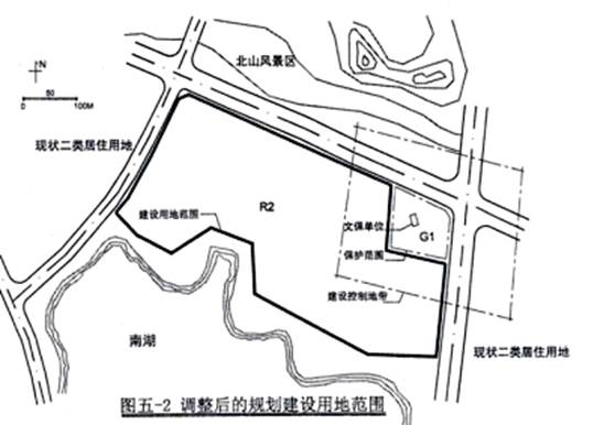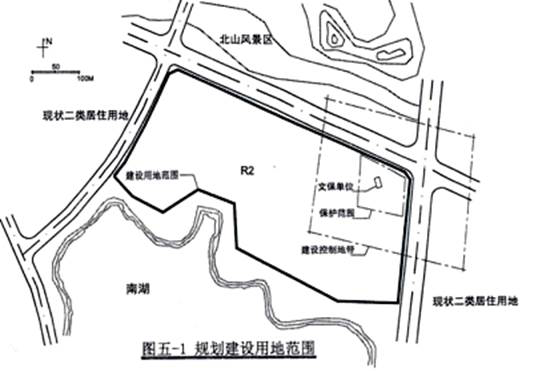 某县城一地块北依北山风景区,南邻南湖,现状东、西侧均为二类居住用地。控制性详细规划确定该地块用地性质为二类居住用地,建筑高度不高于15米容积率不大于1.5,建筑密度不大于35%,根据控制性详细规划指定的规划条件已包含在土地出让合同中。A公司依法开工后,在基础施工过程中发现基地内有宋代墓葬。文物管理部门经考古勘探,确定其为县级文物保护单位,会同规划行政主管部门划定并公布了文物保护范围和建设控制地带。县政府办公会会议纪要确定,文物保护范围的用地性质调整为对社会开放的街头游园,要求A公司调整建设方案(调整后的建设用地范围如图5-2所示)。