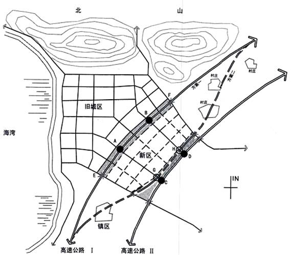 某发达地区一中等城市,东侧有高速公路Ⅰ和高速公路Ⅱ平行通过,并各有两个出入口(分别为A、B和C、D)与城市主要交通性干路相接。该城市背靠北山、西邻海湾,近年来城市发展空间收到了一定的限制,市政府决定城市跨越高速公路Ⅰ发展,建设新区。