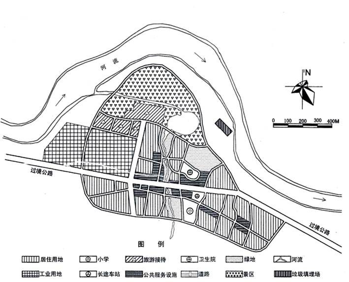 (1)城镇规模 ①该镇处于水源保护区,一直执行生态移民政策,且是传统农业镇,11 年时间人口从2800 多人增加到6000,明显不合理。 ②该镇处于西北地区难得的富水之地,土地资源异常珍贵,所以应该节约用地,人均149 平方米的用地显然太过浪费,也不符合国家不超过140 的规定。 ③过境交通不能布置过多商业、工业、居住。 (2)产业发展 产业布局不合理,电解铝属化工产业,对城市污染太大,与旅游城市定位不符。 (3)布局 ①工业用地位于上风上水方向,污染严重。 ②工业与景区太近。③旅游接待用地侵占景区范围。 ④工业用地临近河岸布置不合理,占据岸线资源。 ⑤学校与对外交通太近,有干扰。 ⑥工业用地与其他用地之间没有隔离带。 ⑦公共设施不集中,应该集中设置公共设施中心。 ⑧汽车站应在城市边缘。 ⑨沿河没有绿化带。 ⑩小规模城镇宜紧凑布局,该镇为两翼发展,不妥。 (4)道路 ①路网结构混乱,级别划分不明,系统性太差。 ②过境交通穿越城市,且对城市开口过多,对城市干扰较大。 ③过多丁字路口和斜交路口,④小学和医院可达性太差。 (5)市政设施 ①垃圾填埋场离建成区和水体都太近,且没有绿化隔离带和防护带,污染严重,不符合相关规范要求。 ②缺少给水、污水、雨水、电力、电信、燃气等市政公用设施。