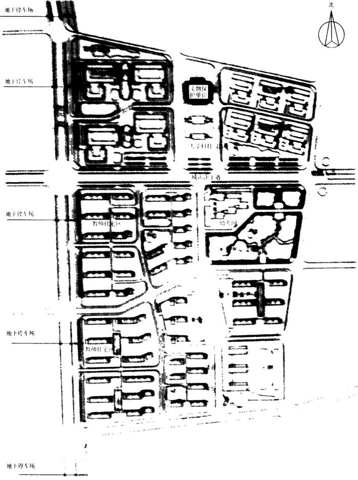 图2为某市大学科技园及教师住宅区详细规划方案示意图。规划总占地面积51公顷,地块西边为城市主干道,道路东侧设置20米宽城市公共绿带,地段中部的东西向道路为城市次干道,道路的北侧为大学科技园区,南侧为教师住宅区。