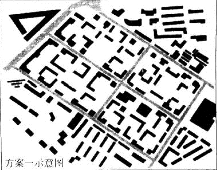 图1 方案一示意图与方案二示意图 【问题】从建筑布局、道路交通、公建设施、街道空间方面分别评析方案一和方案二各自的主要优缺点。