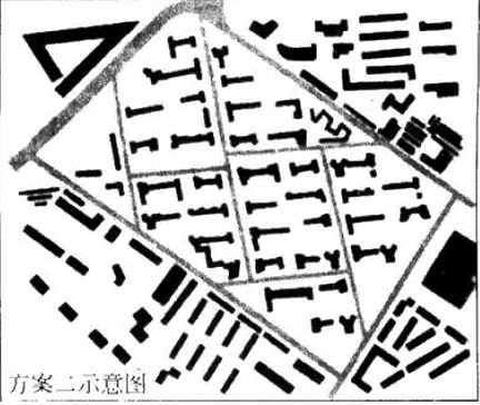 方案一: (1)优点:①建筑布局与内部道路平行于周边路网,有利于衔接城市交通。并与城市肌理完全一致。 ②公建设施布局于居住区内部,有利于对内服务。 ③内部围合空间错落有致,易于形成不同的组团公共绿地和空间。 (2)缺点:出现了大量非正南北向的住宅建筑,不利于日照条件满足。 方案二: (1)优点: ①建筑基本为正南北向,有利于日照条件满足。 ②沿城市道路形成了许多三角形开放空间,易于产生丰富的街道空间场所。 (2)缺点: ①内部道路与城市路网系统斜交,不利于交通疏解,且有畸形四叉路口出现。 ②公共设施位于局部形成的畸形地块,面积规模等不易有合理保证。