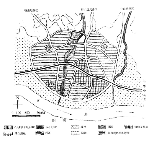 某大城市在城市中心区外围规划有一处独立建设组团,主要功能为居住和公共服务,可容纳居住人口约4万人。组团整体地势北高南低,南临城市主要行洪河道,北倚山地林区,有东西方向的轻轨和干道与东部城市中心区联系,有三条南北向干道向北通往山林地区,其中,中间的南北向干道是通往市级风景区的主要通道。