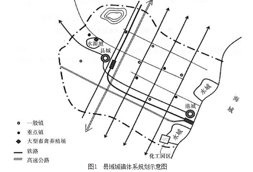 如图1所示,某东南沿海城市,县域内用地平坦,东南部沿海地区建港条件良好,结合沿海优势设置了港城一座。县城位于县域西侧,县域内有多个重点镇及一般镇。目前县域城镇化率为51%。2018年县域人口100万。近年来全县人口呈净流出趋势,为促进县域发展,规划确定了港城与县域间的发展主轴线。规划至2035年总人口达到120万人,县城人口90万人。