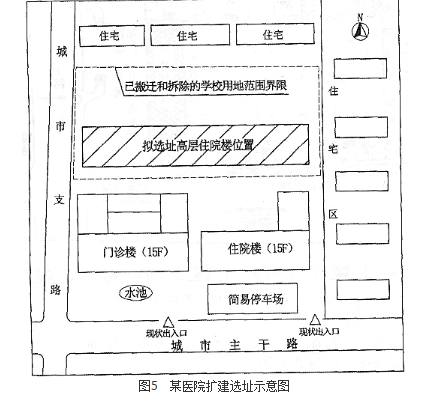 某省会城市医院,因床位紧张,绿化面积不够,门前主干路交通阻塞等原因,急需扩建改善。其北侧的学校已搬迁至新校区,原学校建设用地拟划拨给该医院,作为扩建高层住院楼的选址。