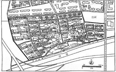图3为中国北方某城市一个居住区规划,用地东临主干路,北临次干路,南侧和西侧均为支路。用地北侧和东侧均为已建成居住区,西侧用地为高速公路隔离绿化带,南侧用地为滨河绿化带。基地面积共计40hm2。控制性详细规划给定的指标为容积率2,限高70m,当地住宅日照间距系数为1.6。按照控规要求,地段内需要设置一处加油站。