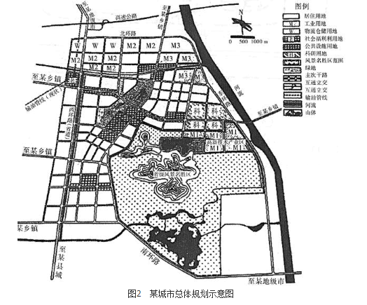 图2为某县级市城市总体规划中心城区用地布局规划方案。该市位于Ⅱ类气候区,规划人口32万人。现状人均城市建设用地103.5m2,规划人均城市建设用地为112m2。