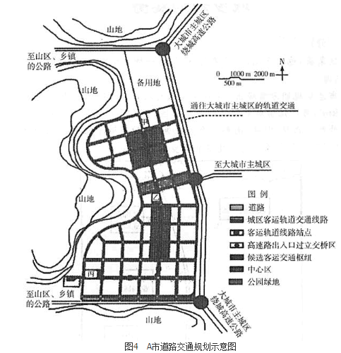 A市三面环山,是某大城市主城区周边的县级市,有一条干路与大城市主城区直接连接,南北分别有公路向西联系山区的乡镇,紧邻A市东侧有大城市主城区的绕城高速公路,规划一条从大城市主城区进入A市的轨道交通客运线,贯穿A市城区南北,现要结合轨道交通站点,选址一处A市的客运交通枢纽。