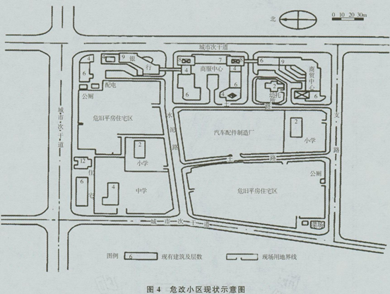 试根据现状条件(如图4)及一般危改居住小区的规划设计要求,提出需要调整和增加的主要内容。