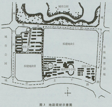 某建设单位通过参与国有土地使用权拍卖,竞得某城市中心区两个地块的土地使用权。两地块面积共46hm2,规划性质为居住和公建,建设总量控制为住宅60万m2,公建40万m2。该地段西侧、北侧为城市公园,东侧为市级体育设施。地块南侧和东侧临城市主干路,西、北两侧为城市次干路。城市干路围合范围内的用地面积为85hm2,其中已建成3个居住小区,分别位干该地块的南侧和北侧,已按小区规模安排了配套设施,并已有一所中专学’校。