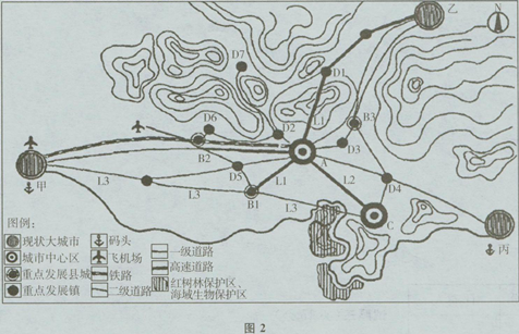 ③为促进区域协调发展规划完善道路交通体系网,拟加快环形公路网建设,重点建设L1、L2、L3三条道路,其中L1为连接B1、A及D1的高速公路,L2为B2、A及C的高速公路,L3为连接甲、B1及C的滨海道路,以加强各城镇之间的联系。