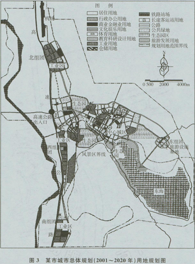 某城市位于我国西南部,是中国航天城,省级历史文化名城及旅游服务基地。规划人口50万人。城市周边群山起伏,东南有东海(高原湖边),是一个风景区和风景旅游地,根据风景区及生态园建设和保护要求,沿海岸线80m为建设控制地带。城市的对外交通有一条高速公路、108国道、电气化铁路及机场。城市结构呈“两片四点”放射状城市组群。“两片”是指构成中心城区的两片,“四点”是分散的四个组团。该市总体规划如图3所示。