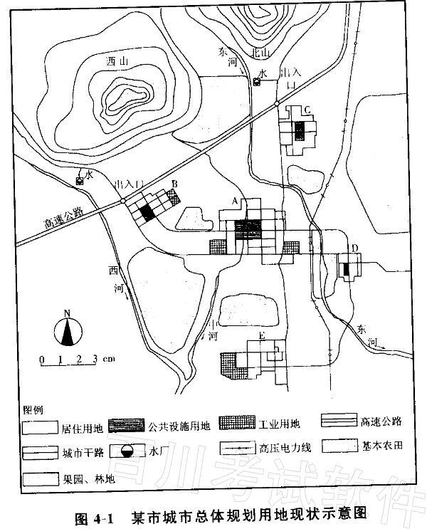 某地级市总体规划确定,主城区在现状基础上仍分为5个组团,该市地势西北高,东南低,有3条河流,主导风向东北风,主城区现状常住人口60万,规划人口规模为90万。城市总体规划用地现状示意图如图4-1所示,城市总体规划用地布局规划示意图如图4-2所示。