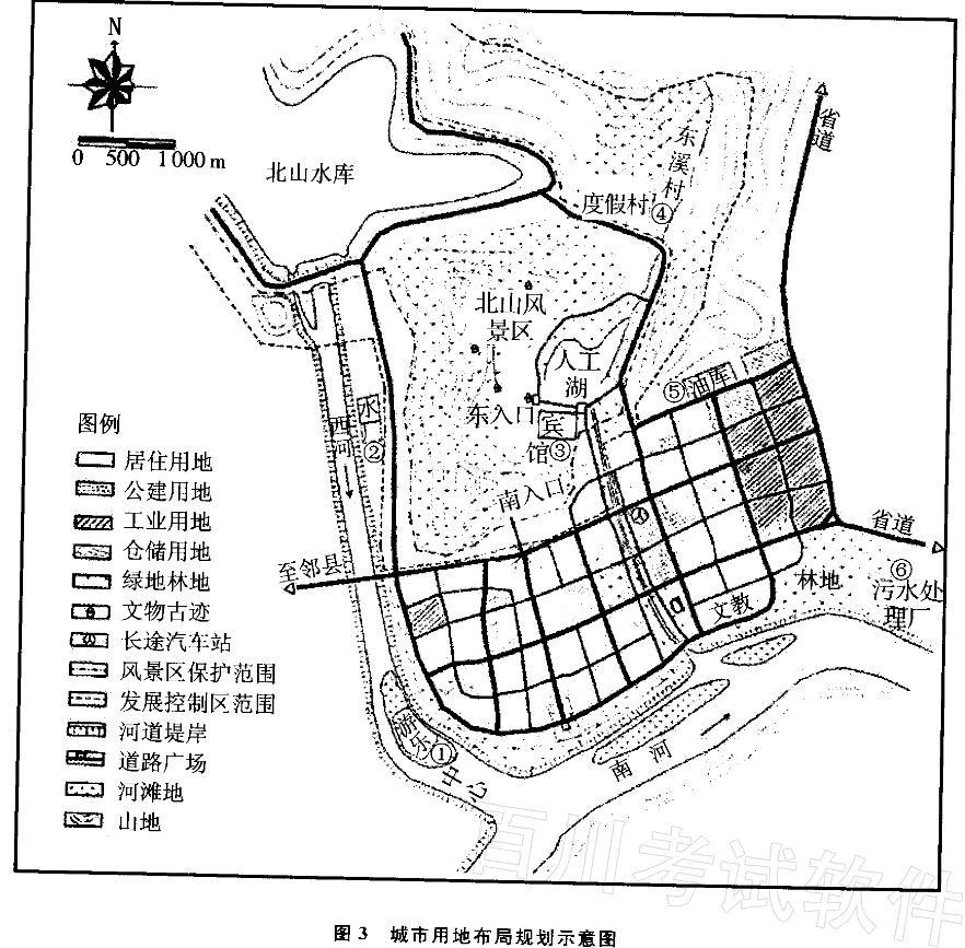 某小城市城区依山临河而建。城北为风景区(含北山水库),该风景区按规划保护较好。水库库容属中型,用作灌溉及城市水源,南河水源丰富,西河为水库泄洪道。沿河的人工堤岸能满足城区防洪要求。