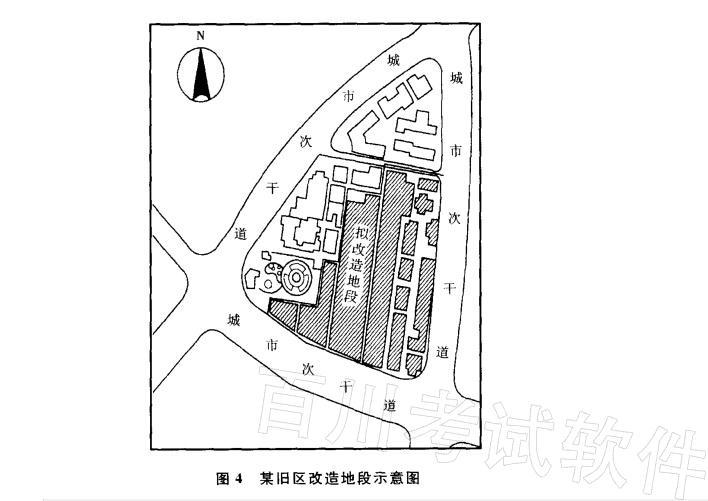 某开发建设单位申请在某城市中心区进行旧区改造,建设商贸、办公建筑项目。该地段西侧为风貌性建筑,集中成片,并有小游园一处,现已批准公布为“保护近代西式住宅风貌为主的历史街区”的重点保护区。拟改造规划可用地面积约3hm2,为历史街区保护的建设控制地带,其中有几幢可保留的风貌建筑,旧区现状如图4所示。经城市规划管理部门研究后,认为该申请建设项目与城市总体规划确定的用地性质相符,但在改造中必须严格有效控制,为此拟出了修建性详细规划的部分规划设计条件。