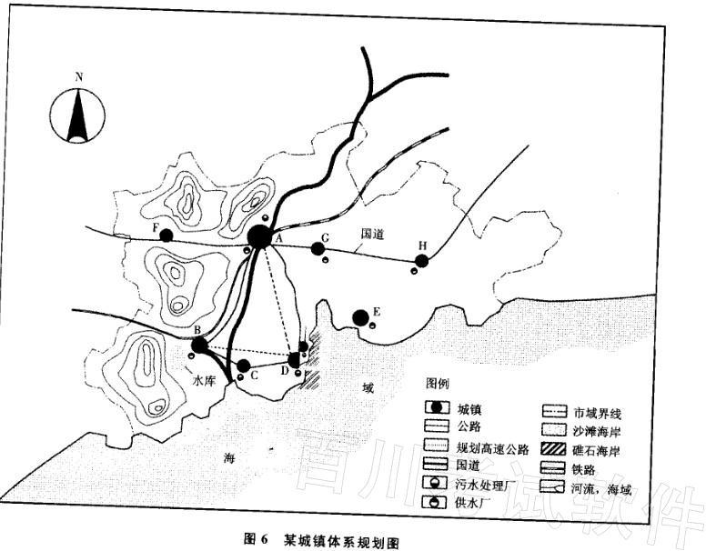 该城镇体系内有多个城镇,其中A城为中心城市,人口约100万,C城为大型化工城市,D城建有大型码头。各城镇之间有公路、铁路相连,并且规划在B城与D城、A城与D城之间修建2条高速公路。城市A、C、D建有污水处理厂,城市A、B、E、G、H建有供水厂。该城镇体系规划图如图6所示。